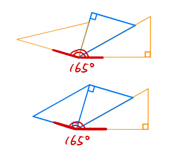 ここまでは和と差で角度を作ってきた。しかし、「外角」の概念を使えばもっと自由に角度を作ることができる。したがって、165度=(180ー15)度 をつくるためには、15度の外角を利用すればいい。つまり、下図のようにすれば良い。
