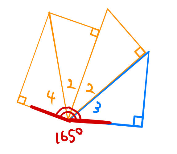 漏れがあるといけないのでPythonコードを用いて計算してもらった。どう頑張っても外角なしでは鬼門である165度に対応する11はつくれない。11以外の16個について対応する三角形は、この記事の一番初めに示した図に載せている。