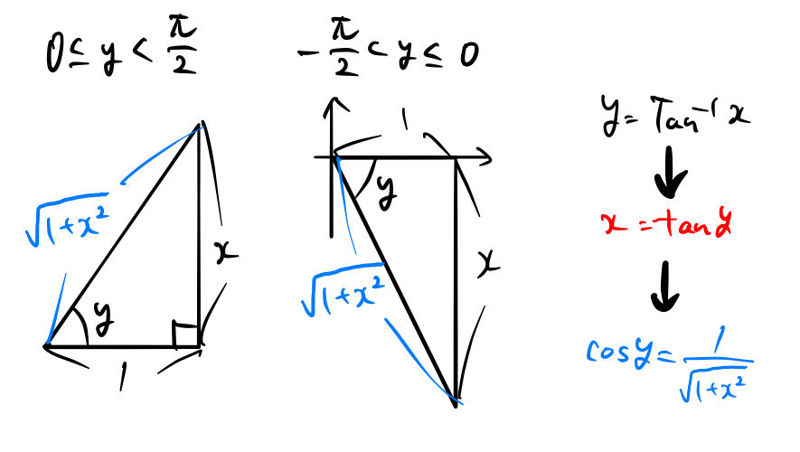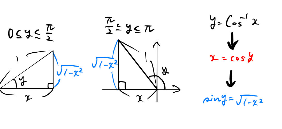 以上のように具体的な直角三角形を描くことで、sinの値からcos(とtan)の値を容易に求められる。ただし、角度に注意した絵を描く必要があり、符号についても十分注意しなければならない。