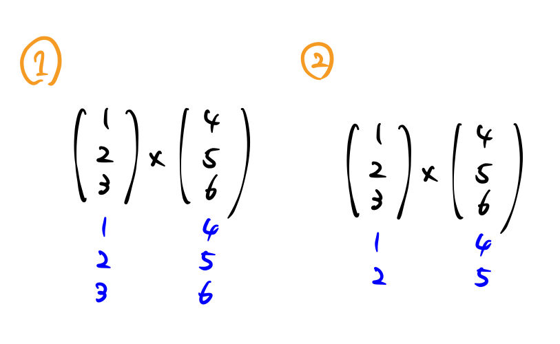 縦ベクトルを使うと間違えにくい。さらに、下に数字を書き加えたことで2行目、3行目を1行目と同じ要領で計算することができる。計算に慣れてきたら、数字を付け足さなくても計算できるようになる。